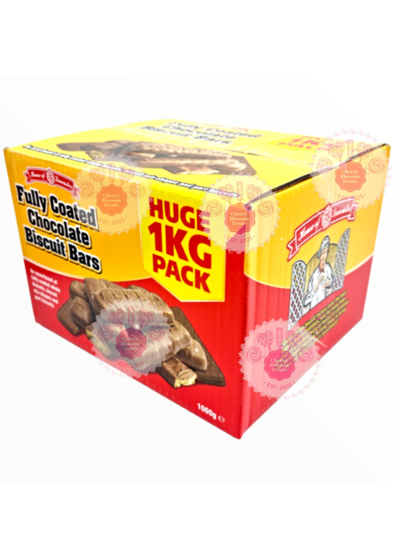 Grab a great value 1Kg box of fully coated chocolate biscuit bars! These delicious biscuits, sourced from a top UK biscuit factory, may include whole biscuits, mis-shapes, and broken pieces. Enjoy the same great taste at an amazing price.