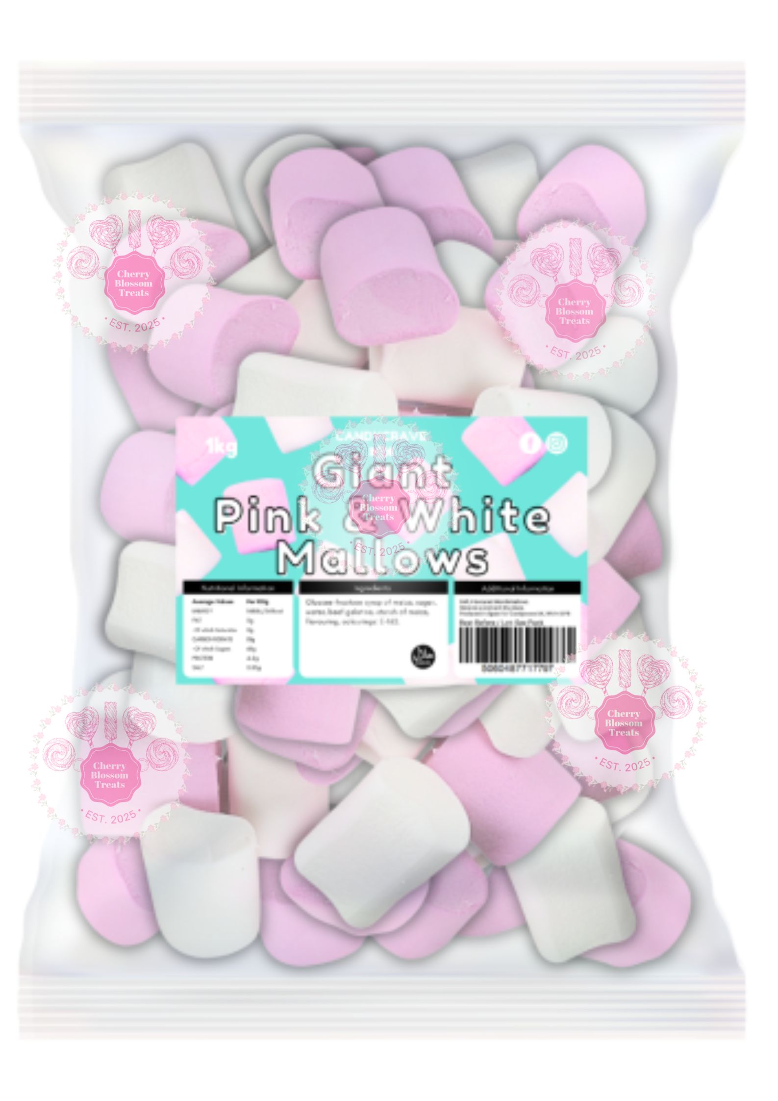 Treat yourself to a substantial 1kg bag of our giant, fluffy marshmallows. These cylinder-shaped delights feature a beautiful pink and white swirl and are made with halal ingredients.