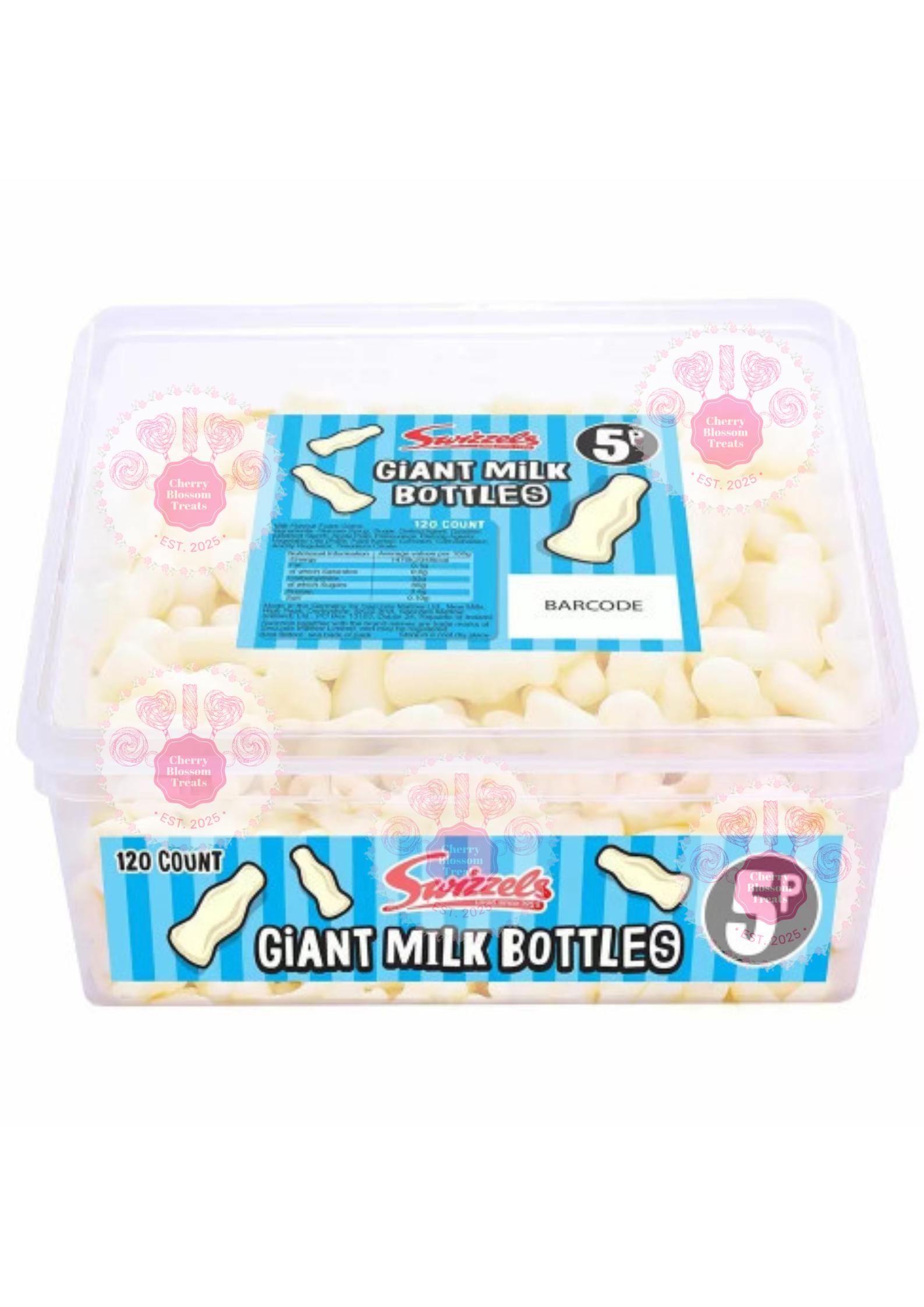 A generous pack of soft and chewy foam gums shaped like traditional milk bottles, bursting with a sweet milk flavour. This bulk pack contains around 120 individual sweets, perfect for sharing or stocking up. Picture for illustration purposes only.