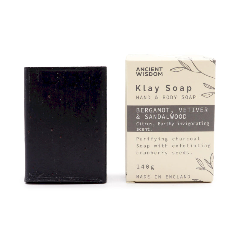 Bergamot, Vetiver & Sandalwood Klay Soap, made in the UK with natural, vegan ingredients. This soap is infused with Fuller’s earth clay and activated charcoal, which work together to detoxify the skin, drawing out impurities while leaving it deeply cleansed and refreshed.