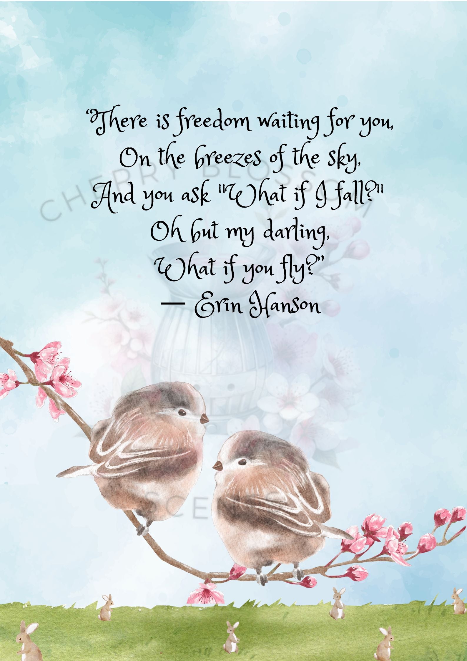 Our "What If I Fall?" digital artwork beautifully captures the essence of the poignant poem. The tender image of a baby bird questioning its flight, alongside the parent's encouraging response ("But what if you fly, darling!"), serves as a powerful reminder to embrace the unknown and pursue your dreams, no matter how daunting they may seem. This piece is a visual celebration of courage, resilience, and the joy of soaring to new heights.